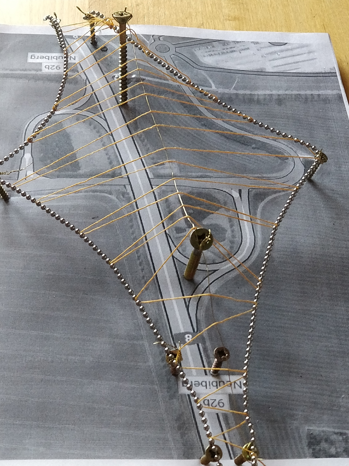 Dieses Modell zeigt am oberen und unteren Bildrand ein Satteldach über der Autobahn, das über den Auffahrten durch Spannseile aufgeweitet ist. Das Satteldach ist durch ein Firstseil/Pfette und Spannseile anstelle der unteren Pfetten charakterisiert. Dazwischen Sparrenseilen und schließlich Lattenseile, an denen die PV-Module befestigt sind.